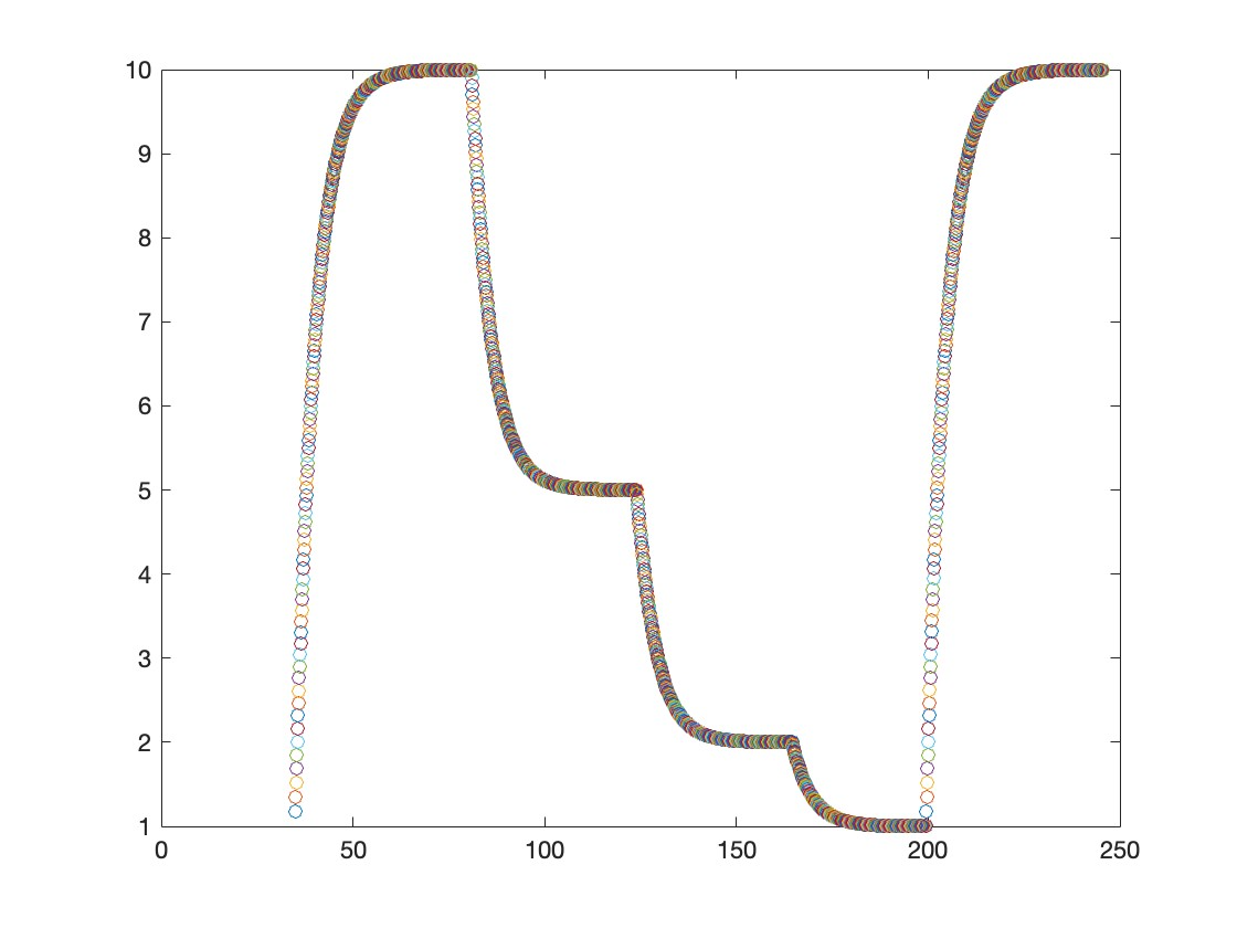 分别给出几个输入值,可以从图中看出输出缓慢靠近输入的值;