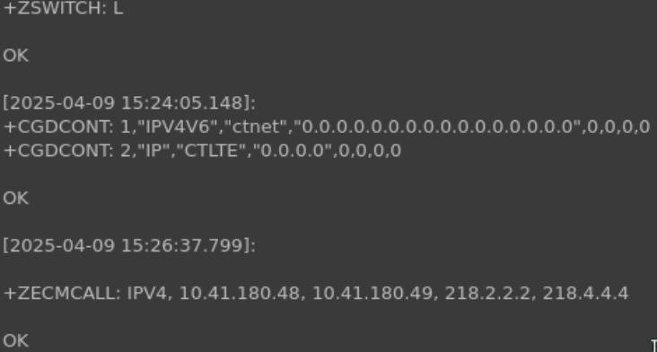 AT+ZECMCALL=1 //这一步用于ECM数据拨号