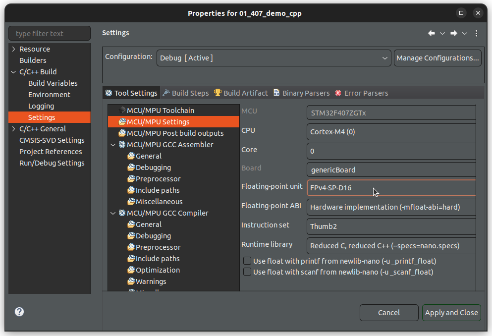 开发环境 Stm32f407zgt6 CubeIDE 如何配置 在默认情况下,FPU一般为开启的, 在cubeide中可以在项目属性Properties -> C/C++ Bulid -> Tool Settings -> MCU/MPU Setiing 中看到 Floating-point-uni